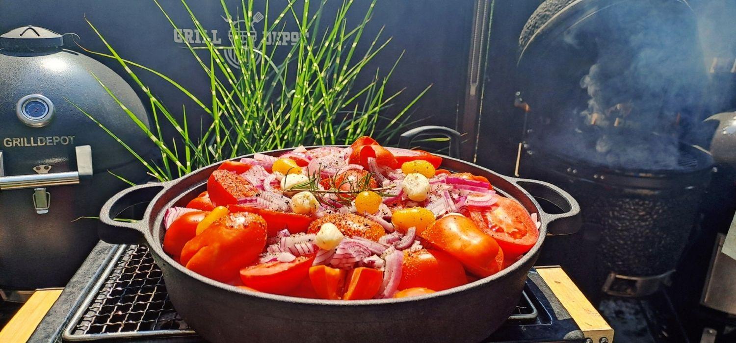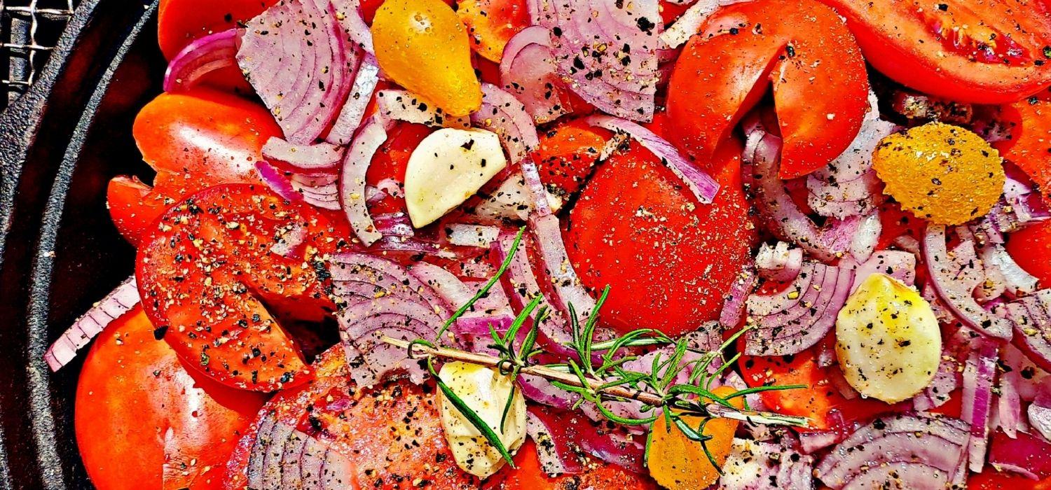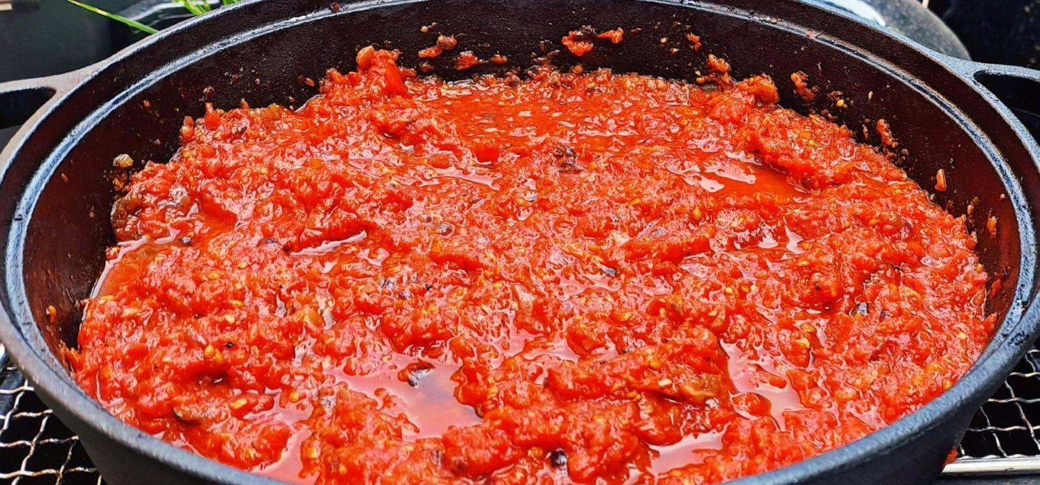 Ha minden hozzávaló megvan, helyezzük az edénybe és alaposan keverjük össze. Paradicsom fajtájától függően 2-3 dl vizet is tehetünk hozzá. Ezután a 120 celsiusos kamadóba helyezve 3 órán keresztül hagyjuk készülni! Használhatunk füstölőfát a készítésnél. Nagyon izgalmas ízt tud teremteni később az ételeknél a füst.