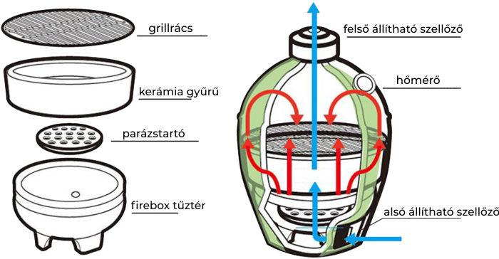 Nincs még egy olyan grillsütő, mely ennyi mindenre képes! Ha használtál már gázgrillt és faszenes grillsütőt, akkor egy kamadó vásárlás után garantáljuk, hogy soha többet nem váltasz másra! Ráadásul ezekben a faszén tüzelésű kerámia grillekben nem csak grillezhetsz, de kemenceként is használhatod. A hagyományos sütőkben soha nem fogsz tudni igazi pizzát készíteni, a kamadóban ezt is lehet! 350°C-on a pizza percek alatt megsül, kívül ropogós, belül puha marad. Füstölőfa csipsz használatával füstölhetsz is. A kerámia kamadókban viszont kétségtelenül az alacsony hőfokon történő barbecue sütés az igazi élmény!